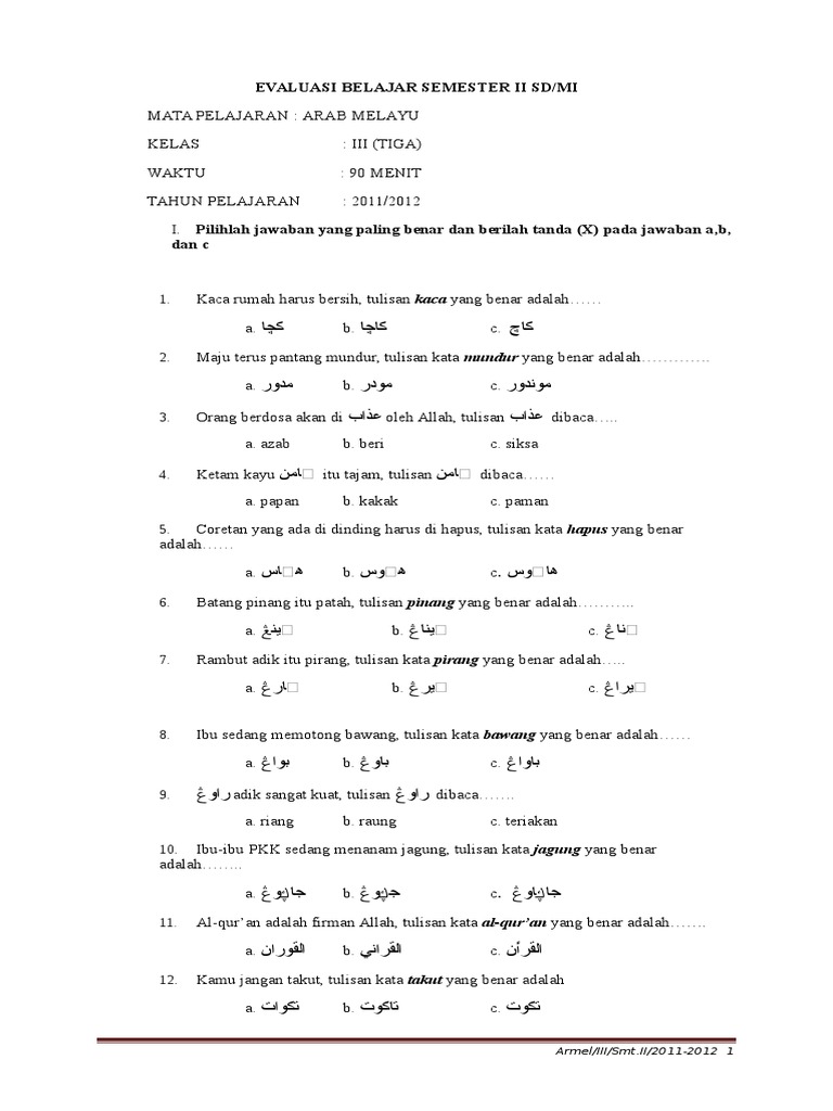Soal Arab Melayu Kelas 2 Semester 2 - Soal Ujian Bahasa Arab Kelas 2 Mi Semester 2 Dan Kunci Jawaban : Baiklah, berikut adalah contoh soal ujian bahasa arab kelas 2 mi semester 2 lengkap dengan kunci jawaban dan pembahasan soal.. Soal uts b arab kelas 6 sdit mi semester 2 genap 2017 soalbagus com contoh soal bahasa arab. Soal uts b arab kelas 2 sdit 2f mi semester 2 2f genap. Mau nanya jawaban buku bahasa arab kelas 6 halaman 60 ada yang tau. 2 soal uts bahasa arab kelas 7 mts semester 2 genap daftar lengkap harga kue michelle bogor. Download buku arab melayu kelas 4 sd download file guru.